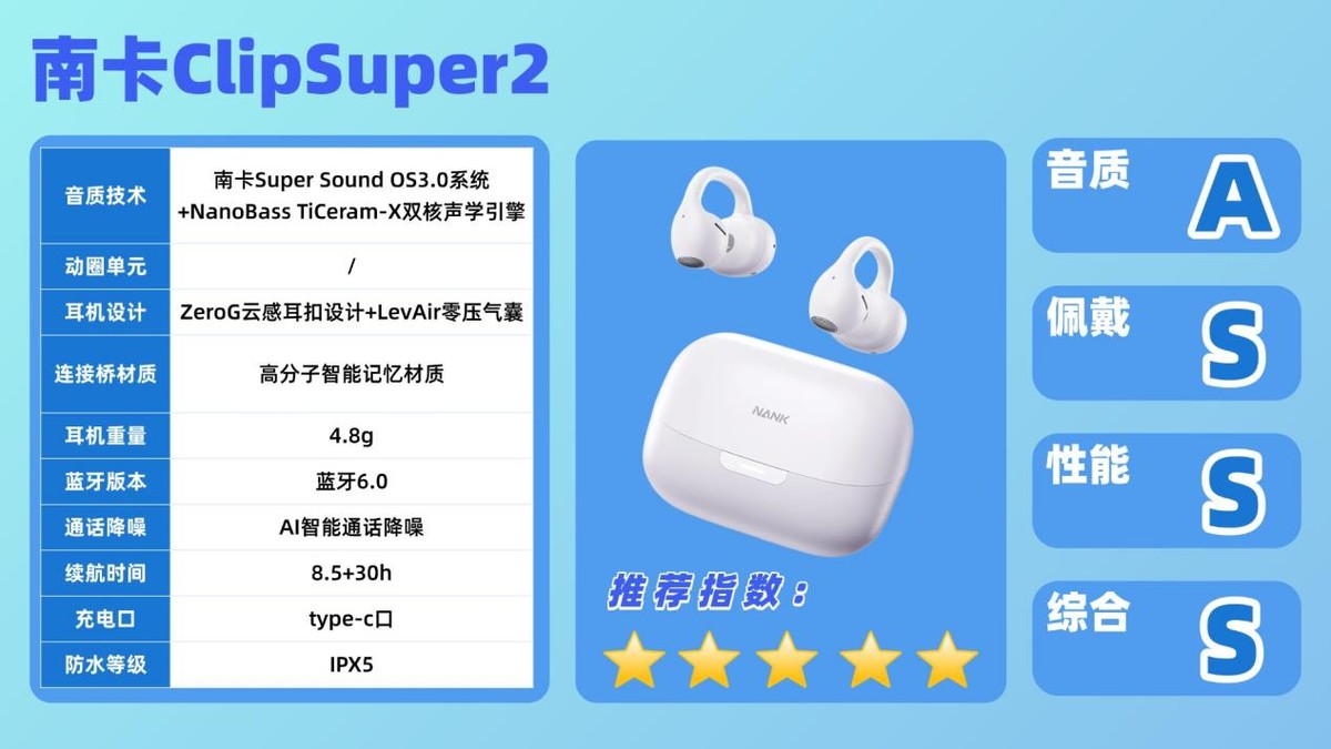 南卡ClipSuper2:南卡算是国内最早做开放式耳机的品牌之一了,在这个领域一直是领头羊。它家有十几年的声学技术积累,早期还给不少国际知名耳机品牌提供过核心技术支持。现在南卡基本可以说是国内开放式耳机里的“天花板”级别。更难得的是,南卡一直坚持靠产品实力说话,不搞明星代言,也不靠网红带货,凭着过硬的音质和体验赢得了很多数码博主和耳机发烧友的认可。