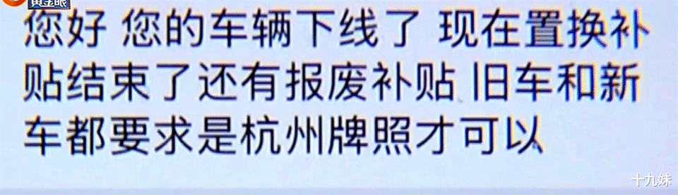 根据俞女士描述,11月3日那天,她接到工作人员的信息,通知她订购的车子已经下线了。不过,对方还附加了另外一条信息:现在置换补贴结束了,还有报废补贴,旧车和新车都要求是杭州牌照才可以。
