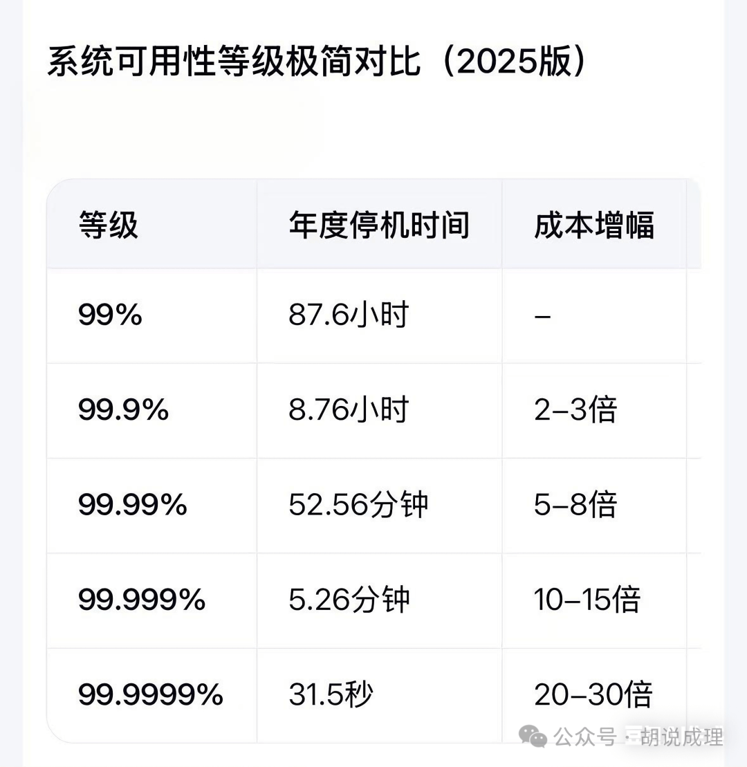 按照运维的通识来说,99.9%意味着在一年里,将有525.6分钟的时间是“不可用”的,而每提高1个9,出现不可用的故障时间则仅为原来的1/10,所以两者之间的区别,是前者的不可用时间高达525.6分钟,而后者只有5.26分钟。