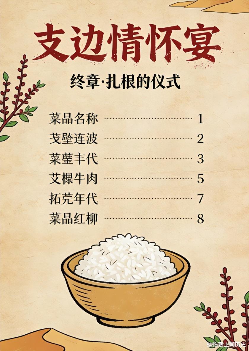 宴席精神: 不讲章法,但求热乎;不求精致,但求真心。每一道都是生存的智慧、混杂的尊严与在绝境中开出花来的坚韧情怀。吃的是饭,品的是那段用青春与热血在塞上书写“家园”二字的磅礴史诗。