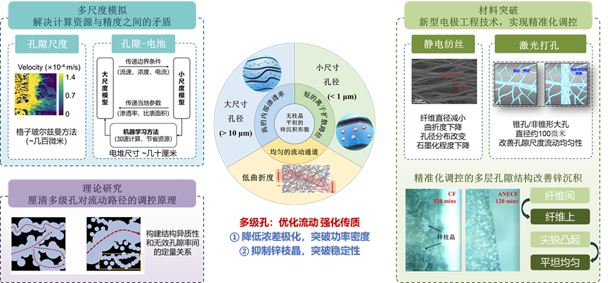 针对高功率液流电池单堆放大过程中存在的非均匀传质与多场耦合失配等工程瓶颈,浙江大学热工与动力系统研究所郑梦莲团队提出了基于功能分区的电堆结构与电极材料一体化设计方法,以高流量区域、高传质能力区域和高反应活性区域的空间重合度为核心优化目标,实现不同功能区域的差异化、定向优化。团队构建了三维多尺度仿真体系,实现了对局部性能的快速预测,并发展了基于流道和宏孔协同的流动路径主动调控技术。在此基础上,构建了大孔承载流量、双尺度小孔强化传质、界面层诱导无枝晶沉积行为的沉积型液流电池电极分区设计方案。相关电极工程设计使全钒液流电池峰值功率密度较商用产品提升约5倍,水系锌基液流电池在120mA/cm²下电压效率突破90%,并在320 mA/cm²下实现了超300圈的无枝晶稳定运行。