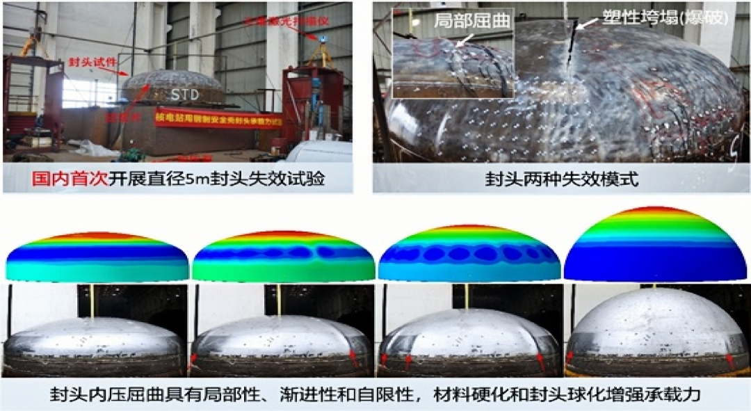 椭圆/碟形封头作为高端装备的核心承压件,其设计理论基于弹性/理想塑性假设导致结构余量过大、难以轻量化等问题。对此,浙江大学特种装备研究所李克明团队在郑津洋院士带领下,历时13年研究,完成了36个最大直径达5米的工业规模封头失效全过程试验,创新引入弹塑性理论,系统揭示了封头“内压屈曲-塑性垮塌”的失效机制,建立了预测精度高的封头失效压力计算公式,充分利用材料应变强化与封头几何球化的双重增强效应,提出了基于弹塑性理论的封头设计新方法。