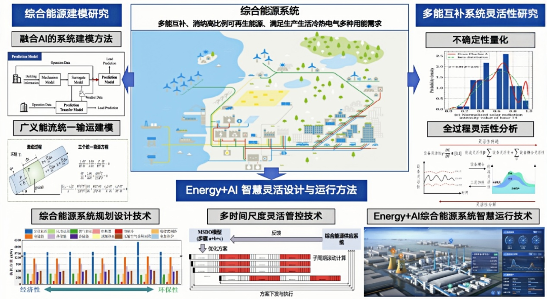 为应对综合能源系统动态分析难、运行灵活性不足的核心难题,浙江大学热工与动力系统研究所林小杰副研究员与团队成员研发了综合能源系统智慧调控技术。团队提出了机理与人工智能融合的数字孪生建模方法,突破了异质流体网络统一建模的瓶颈,实现了系统动态仿真与状态实时分析。在此基础上,建立了量化“虚拟蓄能”的灵活性评估技术,并研发了机理数据融合的综合能源调控平台,实现了多能流、多时间尺度的协同优化。