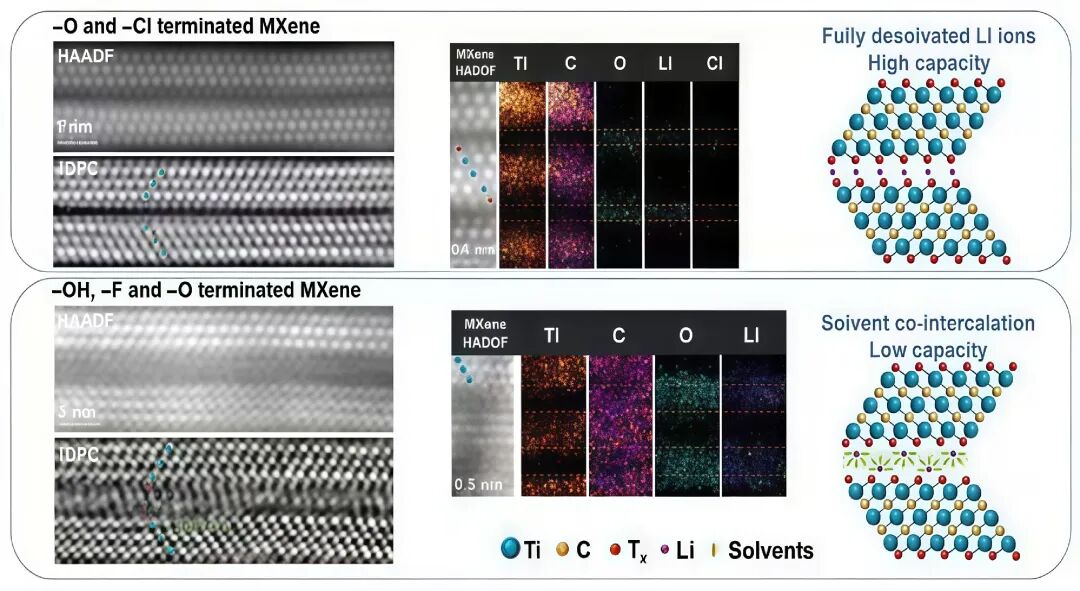 超级电容是我国重点发展的功率型储能技术,其基本原理是固液静电吸附,离子在电极材料内的溶剂化特性对储能性能有至关重要的影响。其中,微孔的电荷存储机制自2006年“离子去溶剂化”猜想提出以来长期缺乏直接证据。针对此难题,浙江大学能源学院薄拯教授团队与法国P.Simon院士等国内外团队合作,将原子级成像技术、数值模拟和电化学测试相结合,通过积分差分相位衬度扫描透射电镜、高分辨电子能量损失谱元素分布图、⁷Li固态核磁共振和程序升温脱附-质谱联用等手段,对过渡金属碳化物赝电容储能中的“离子去溶剂化”和“溶剂共插层”两种界面现象进行了原子级成像和分析,并深入研究了以上两种不同界面状态下的储能性能。