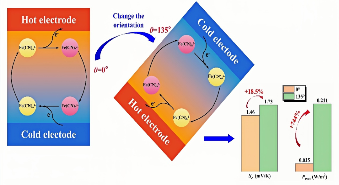 热电化学电池具有较高的塞贝克系数,在低于100℃的近室温低品位余热发电领域应用前景广阔,但功率密度低是限制其应用的主要瓶颈。针对此挑战,浙江大学动力机械及车辆工程研究所李智副研究员团队在液态与固态体系热电化学电池方向取得重要进展。在液态电解质体系中,团队通过调控电解液自然对流强度来改善离子传质速率,实现了功率密度比典型基础体系提升744%;在固态水凝胶体系中,团队创新采用双聚合物网络水凝胶制备方法,提高电解质浓度的同时增强了机械性能,使功率密度提升52%,拉伸极限提升114%。围绕该成果,团队在Energy Storage Materials等能源领域权威期刊发表SCI论文7篇,申请发明专利1项,获授权发明专利2项。相关技术已在管道自供能防腐系统、全天候自供电电致变色玻璃及可穿戴设备等领域开展应用探索,为低功耗电子器件的自供能提供了新的解决方案。