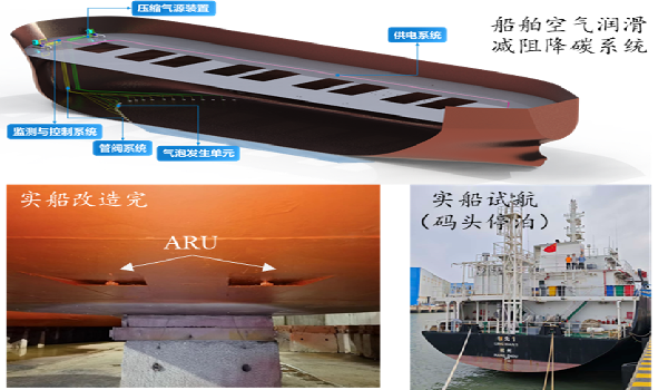 2025年,团队在2600DWT散货船上完成实船安装与长江航道试航,压载实测净节能达6%-16%,节能效果显著。此外,团队正与国内航运龙头企业等合作,推进大型集装箱船、散货船空气润滑减阻系统应用。该技术兼具新造船与旧船改造潜力,为航运业绿色转型提供了有力支撑。