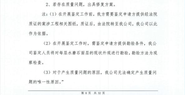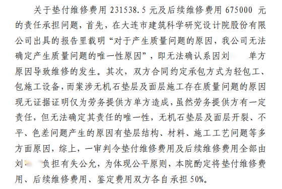 第三个争议为存在瑕疵的司法鉴定报告为何能作为裁判依据。《司法鉴定报告》中,多处将案涉工程实际使用的“无机磨石”表述为“水磨石”,且未明确质量问题唯一原因,但法院仍以此报告为裁判基础,判定刘某芬承担50%的责任。