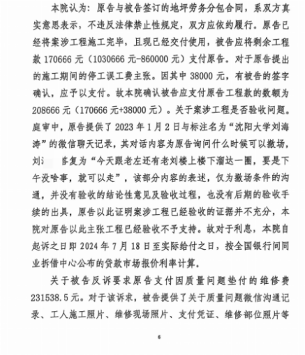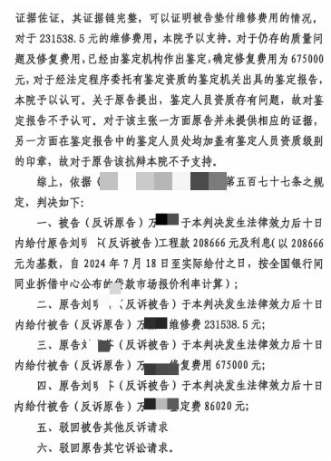 截至2022年底,万某晶仅支付86万元劳务费,剩余21万余元承诺2023年结清,但经刘某芬多次催讨无果,2024年,刘某芬向沈阳市大东区人民法院提起诉讼。不料万某晶随即反诉,以“工程质量问题”为由索赔99.2万余元,包括已发生的维修费23.1万余元、预估修复费67.5万元及鉴定费8.6万余元,但未提供有效证据证明质量问题系刘某芬施工导致。