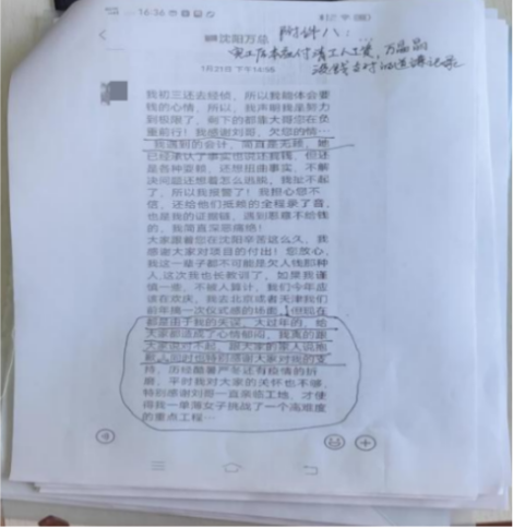 (支付合同、万某晶向工人致歉,刘先生提供)