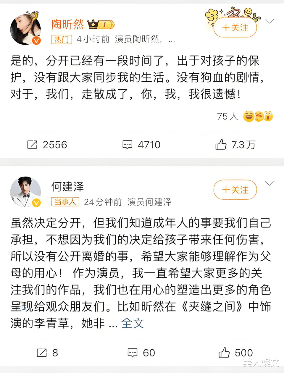 这段曾被众人羡慕的婚姻,背后却藏着不为人知的裂痕。两人自结婚起便约定实行AA制,家用、女儿的学费、奶粉钱等开销均严格分账,甚至何建泽影视公司的大部分注册资本,都是陶昕然抵押房产所得。随着陶昕然的事业稳步发展,而何建泽始终停留在配角领域,两人的事业差距逐渐拉大,加上长期的情感疏离——深夜陶昕然抱着发烧的女儿奔赴医院时,何建泽仍在外地拍戏;她抵押房产支持丈夫渡难关时,对方却无法参与女儿的家长会,这段婚姻渐渐走向平淡与疏离。