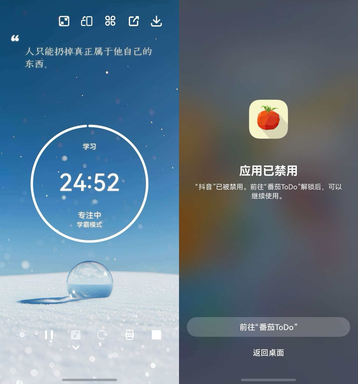 首先,最让我犯愁的就是孩子写作业总被手机勾走神!他这个年纪自控力弱,我们也不可能全程死盯。我给孩子的手机装了鸿蒙版番茄ToDo,只要在番茄ToDo里进入“专注计时”,开启“学霸模式”,手机直接被锁定,孩子想切出去看视频,屏幕就会弹出应用禁用提示。昨天他开着学霸模式写作业,足足四十分钟没碰手机,作业写得也比前几天快多了。