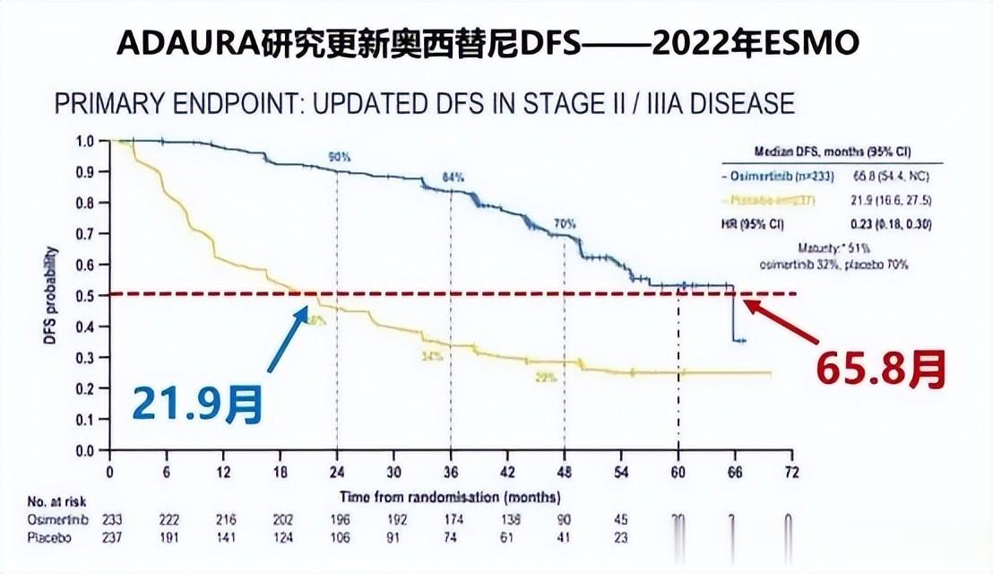 ADAURA是针对ⅠB到ⅢA期肺癌患者开展的术后辅助靶向治疗临床研究,于2020年首发于《新英格兰医学杂志》,并在2022年的欧洲肿瘤学年会上(ESMO)更新了不进展生存数据。