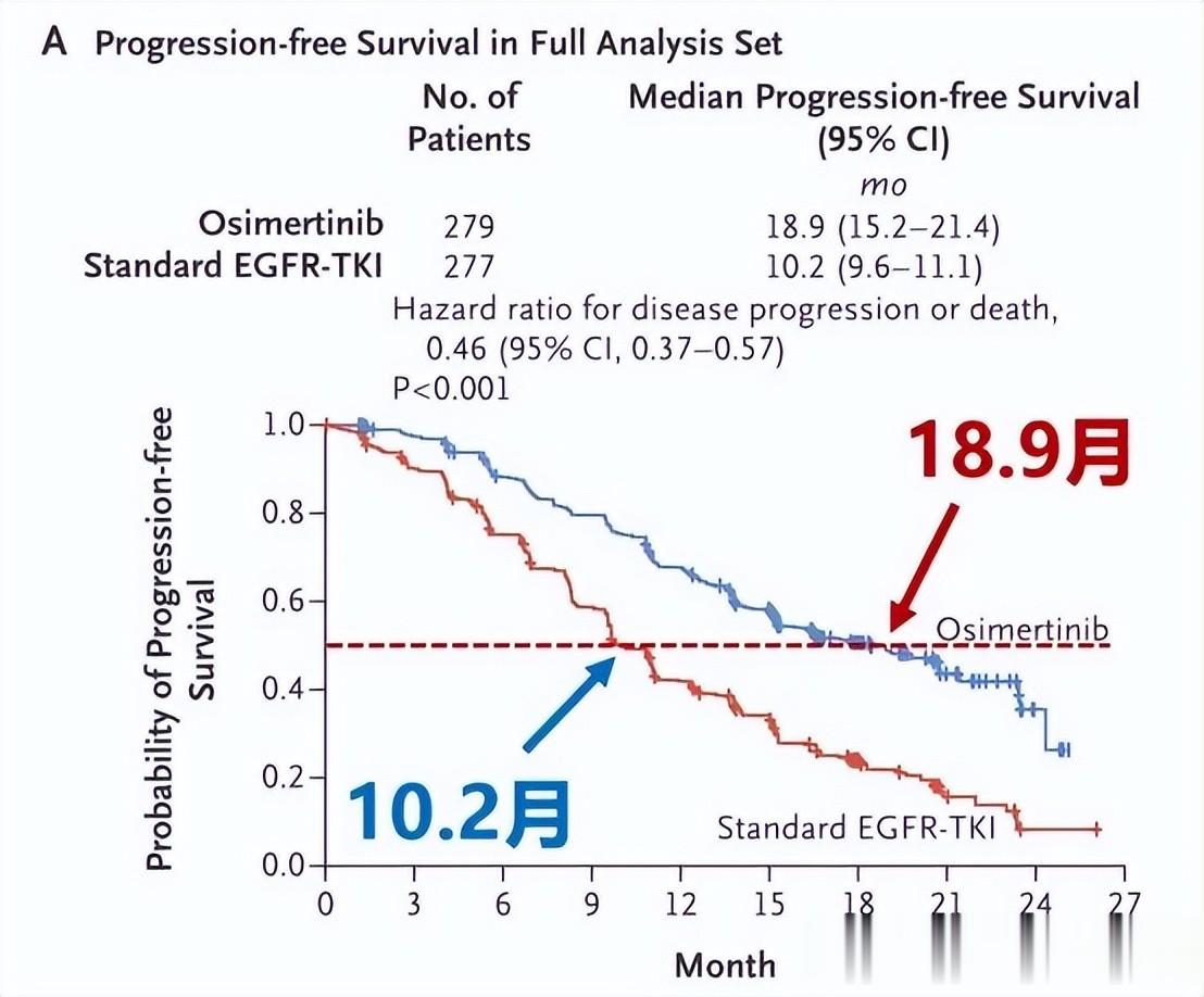 最终,奥希替尼靶向治疗组取得了18.9个月的不进展生存时间,比一代靶向药吉非替尼显著延长了8.7个月。