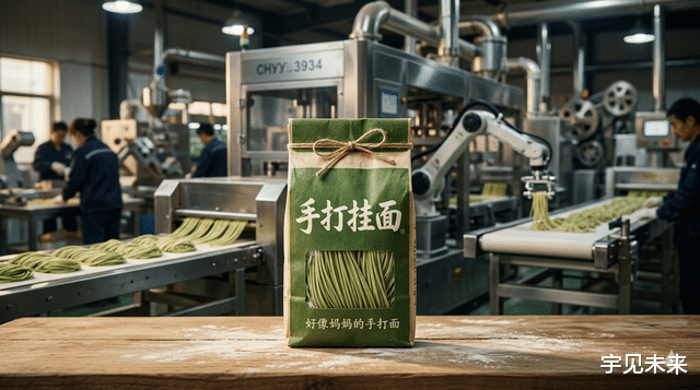 今麦郎旗下的某款挂面,包装上“手打挂面”四个字十分醒目,旁边还印着“好像妈妈的手打面”宣传语。你脑补的是老师傅挥汗如雨、千锤百炼?