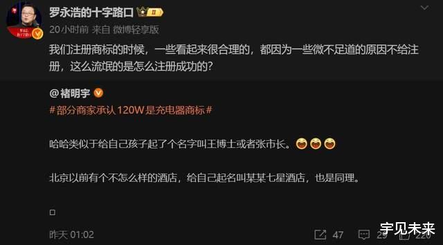 老罗在微博转发吐槽时表示,普通人注册商标时,一些看起来很合理的都因为微不足道的原因不给注册,这种明显的误导性词汇竟然过审了。