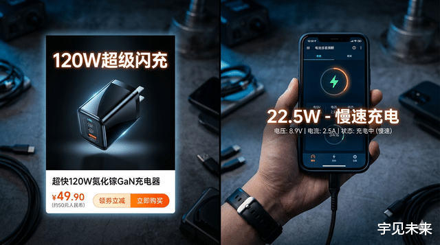 可买回家一试,充电速度慢得像乌龟爬。有消费者实测发现,实际功率竟然只有22.5W,连宣称的五分之一都不到!