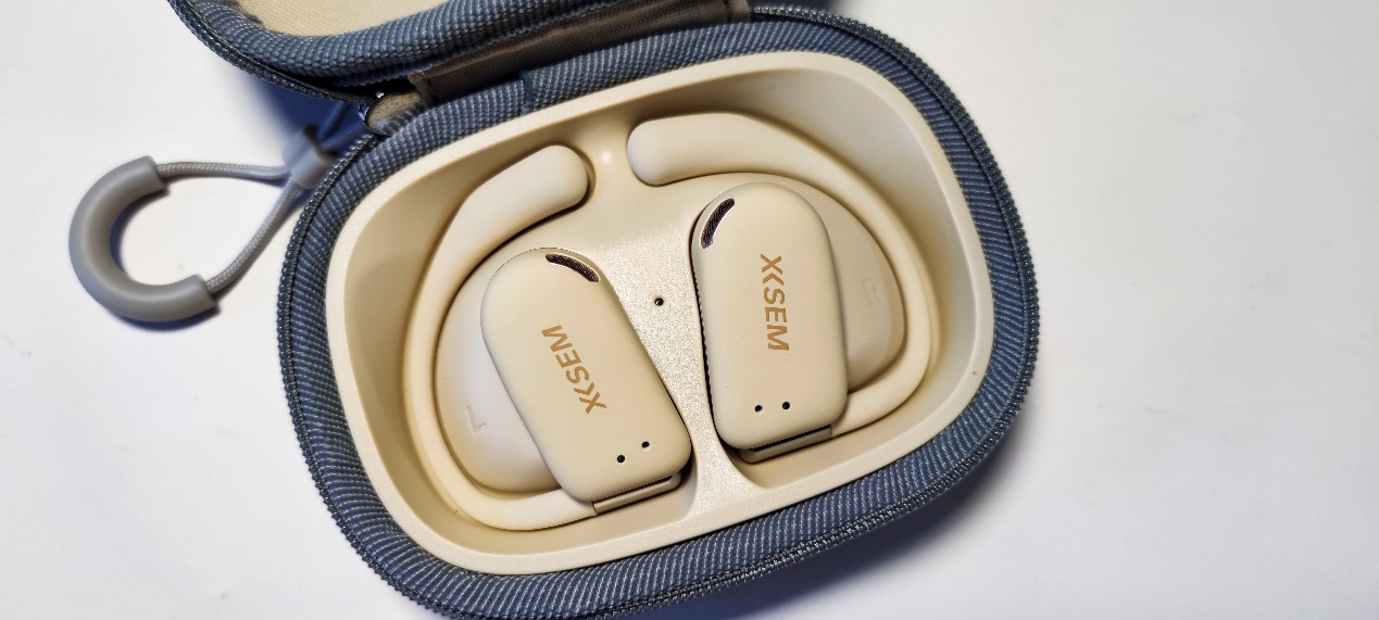 西圣olite开放式耳机整机为卡其色,色彩饱和度较低,更加耐看;耳机表面开孔较少,分别在耳机和充电盒上设置了LED指示灯,一次来判断设备点亮及状态,同时在耳机上LED旁边设置了麦克风,可以更好的拾取人声。