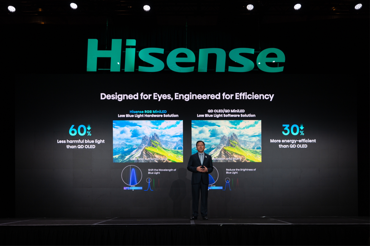算力这边也跟上节奏:自研H7画质芯片把控色精度做到134bits,能分辨百万亿级细微差别,高亮不漂白,暗场不糊黑,全亮度段都能保持高饱和度。更让我在意的是舒适与效率:相较QD-OLED有害蓝光显著下降、比传统QD-Mini LED更低,同时整机能耗再降约30%,既护眼也省电。
