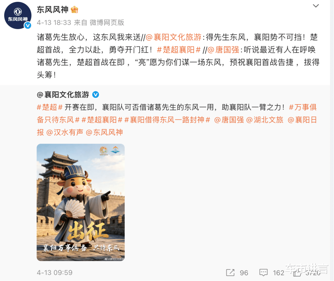 作为最深入人心的诸葛亮扮演者,唐国强老师在微博上为襄阳文旅展台,“亮”愿为你们谋一场东风!玩梗玩到本人身上,这场面也是让评论区直接沸腾:“迎接真神”、“诸葛出山,谁与争锋”、“楚超算是被东风风神玩明白了。”……一场业余联赛,硬是被这波带着文化底蕴的幽默操作带火,让楚超这个荆楚地区的足球联赛,整出了“破圈”的动静。