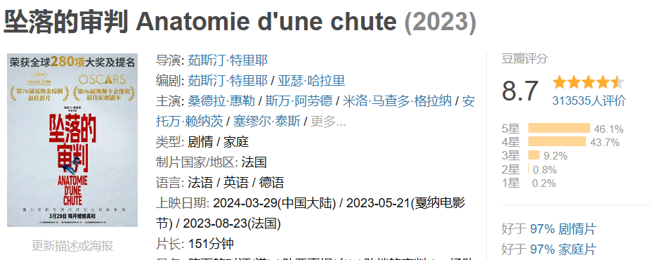 总的来说,《坠落的审判》是一部值得深入探讨和反思的电影。它不仅提供了紧张刺激的观影体验,还引发了观众对于婚姻、家庭和人性的深层次思考。