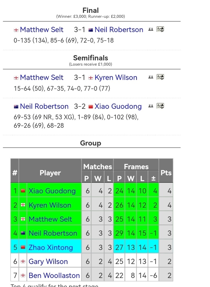 小组赛积分:肖国栋4分、囧哥4分、塞尔特3分、罗伯逊3分、赵心童3分、加里威尔逊2分(出局)、沃拉斯顿2分(出局)