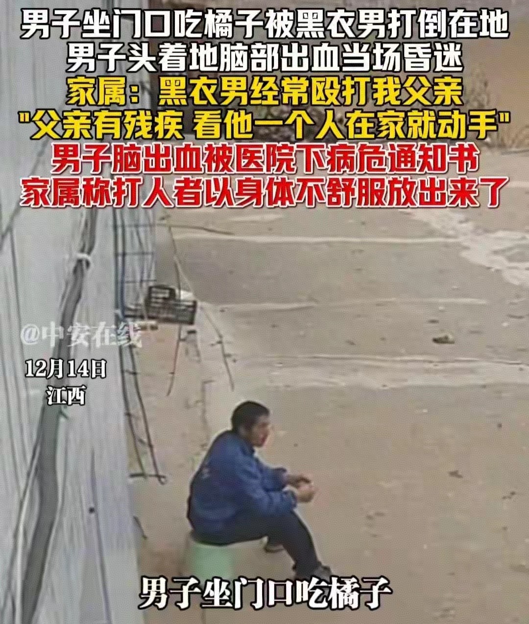 近日,江西宜丰一起邻里暴力事件引发全网热议。61岁残疾男子在家门口吃橘子时,遭邻居一拳打倒致脑出血昏迷,一度被下病危通知书,打人者曾以身体不适被放出,如今官方已介入,伤情鉴定结果出炉,案件正依法侦办。