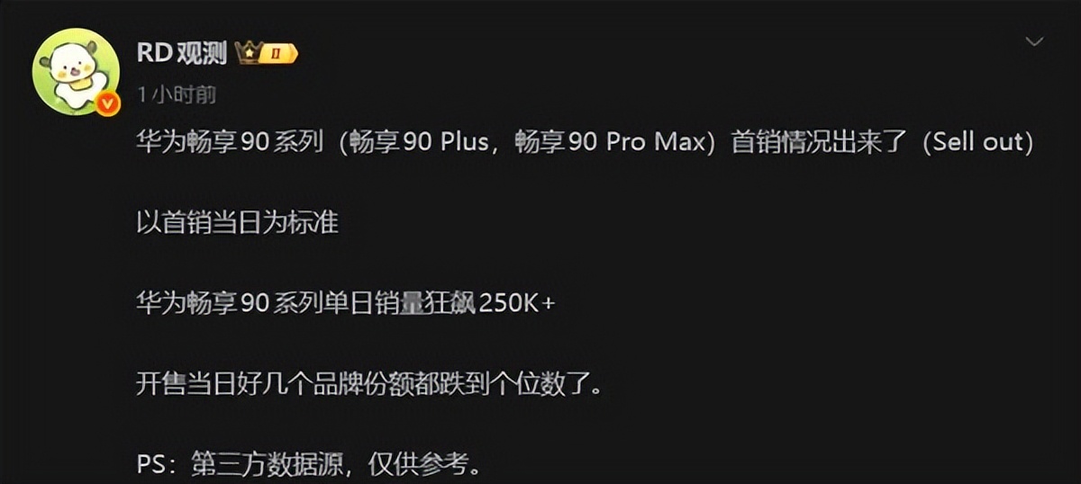 最近根据数码博主RD观测公布华为畅享90系列销量数据,华为畅享90 Plus、华为畅享90 ProMax这两款手机单日销量达到25万台,已经成为华为新一代爆款了,在这两款机型中,笔者还是更推荐入手90ProMax。
