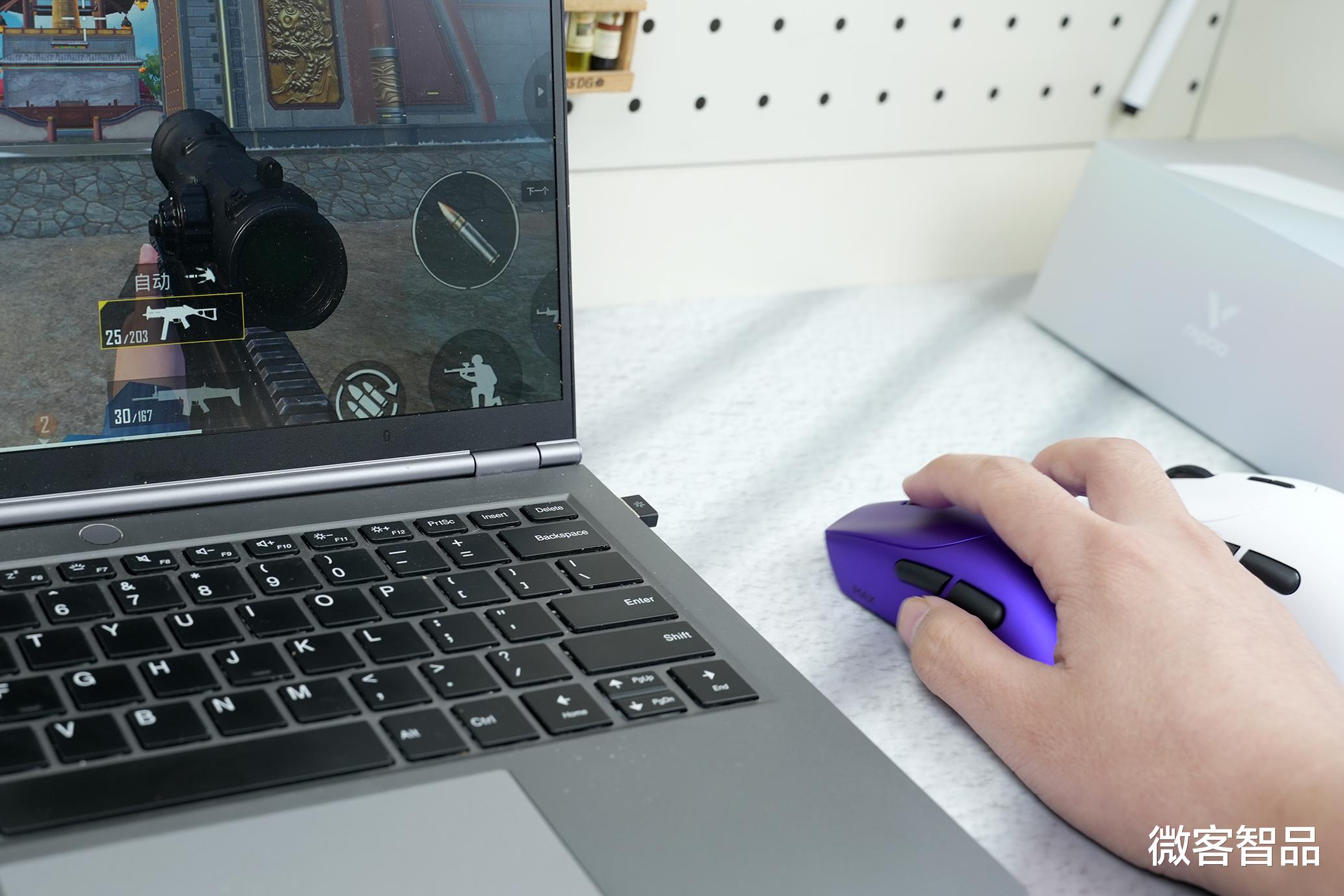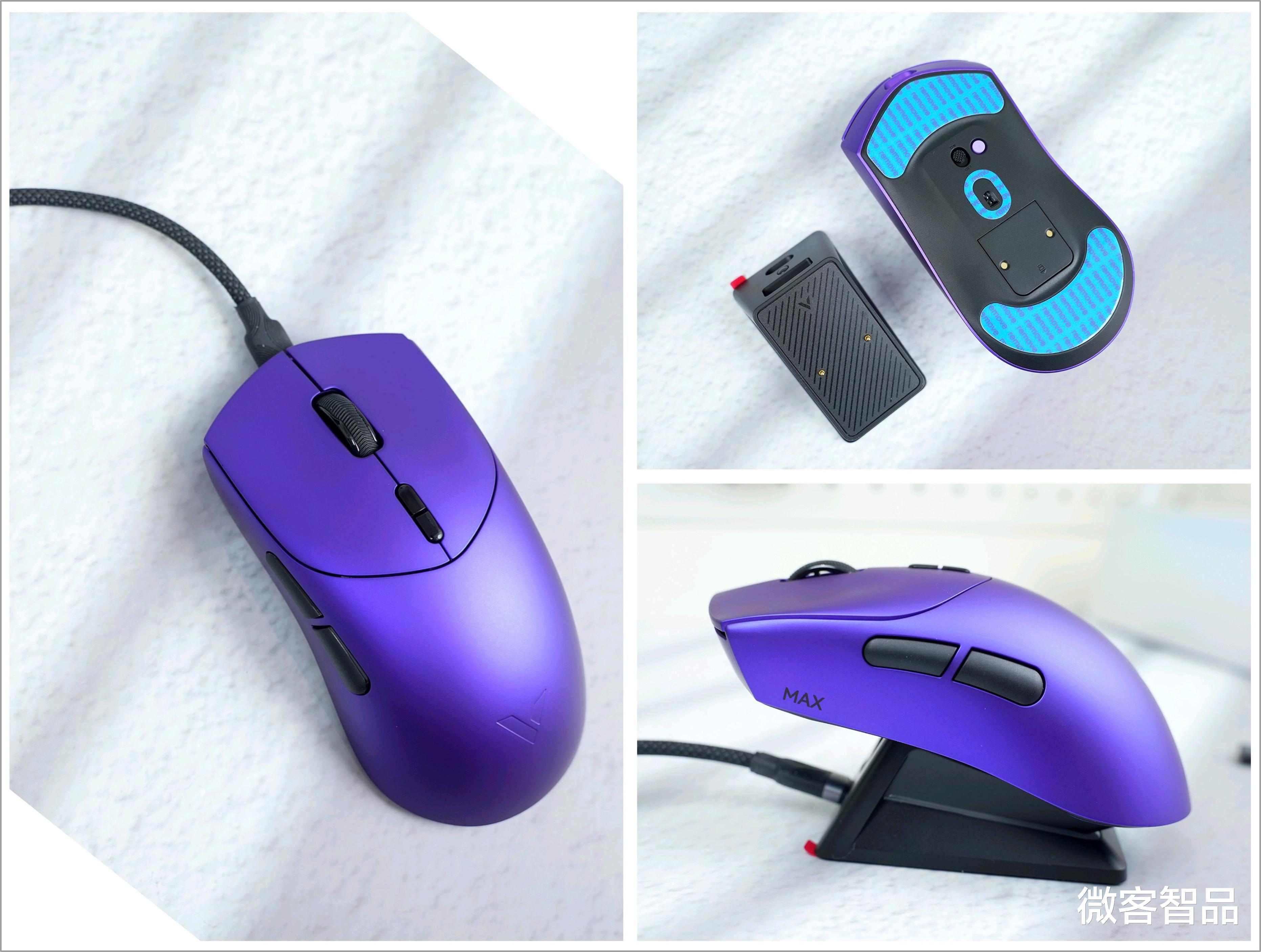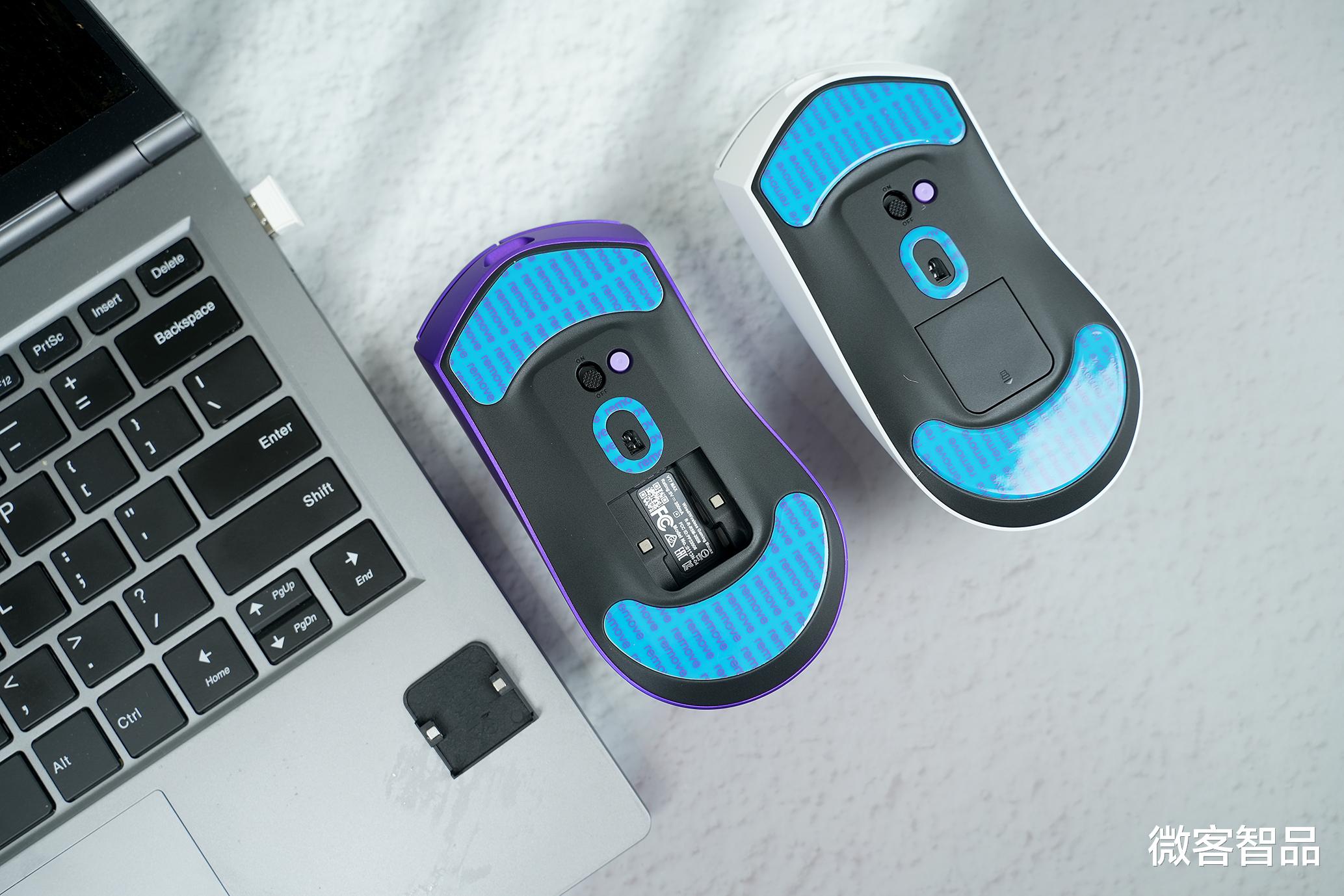 鼠标底部有防滑贴,中间设有开关推钮及紫色的自定义DIY独立键,而磁吸盖板吸力足够,不会轻易脱落,也更方便拆卸。