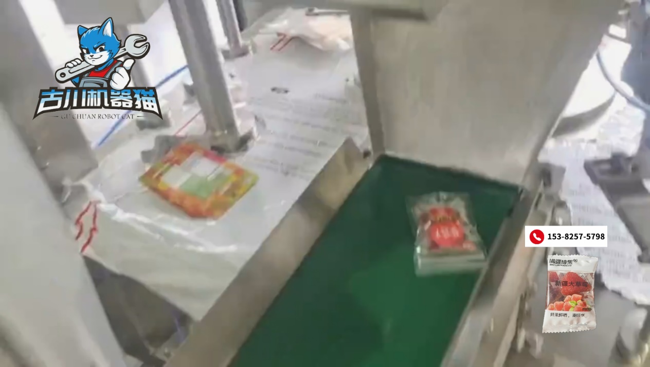 这台设备最“迷人”的地方,是它能够在高速运行时依然保持极高的柔性与精准度。草莓干体积轻、形态不规则,稍不注意就会发生破碎或掉料,而古川包装机凭借智能称量系统与柔性给料结构,能轻柔处理每一份物料,让草莓干“稳稳落袋”,不挤压、不损形,同时保证袋型挺括、封口严密,呈现高品质外观。