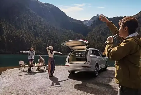还有几个配置特别戳我这个家庭用户。前排的隐藏一体式即热饮水机,支持5档水温调节,3秒就能出热水,带孩子出门时冲奶粉、泡咖啡都很方便,不用再带保温壶了 。外放电功能也很实用,220伏电压能带动电烤炉、投影仪、电磁炉等设备,露营时能煮火锅、烤串、看露天电影,手机没电了还能随时充电。最贴心的是能设置放电限值,比如保留20%电量确保返程,这个细节考虑得很周到。