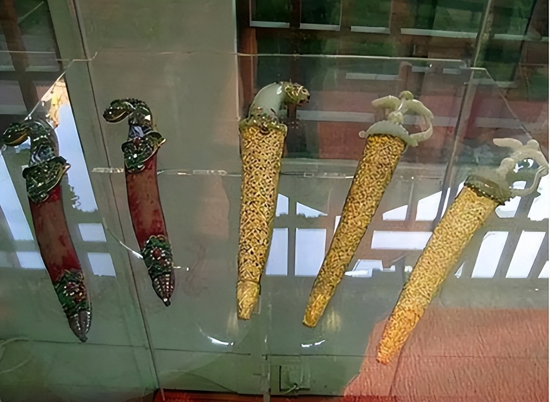 他盯上了养性殿西暖阁。一间不大的展室,放着清代御制金册,八页金片,雕龙嵌玉,光是一页就能压弯半张桌子。旁边还有五把清宫匕首,玉柄、金鞘,寒光一闪,像是随时能跃出历史。