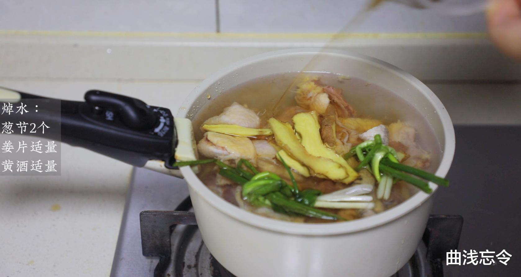 5、鸡肉焯水去腥:鸡块冷水下锅,加入葱段、带皮姜片、黄油,水开后再煮1~2分钟,中途随时撇去浮沫,鸡块捞出用温热水再次冲洗干净。