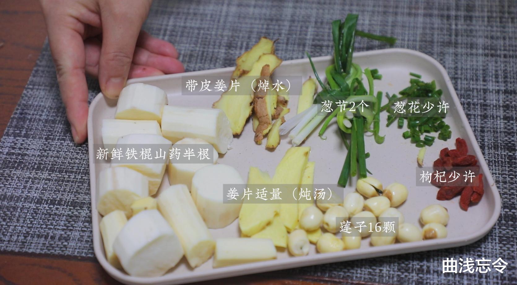 食材:黄油鸡半只、干银耳适量、新鲜铁棍山药半根、干莲子16颗、枸杞少许