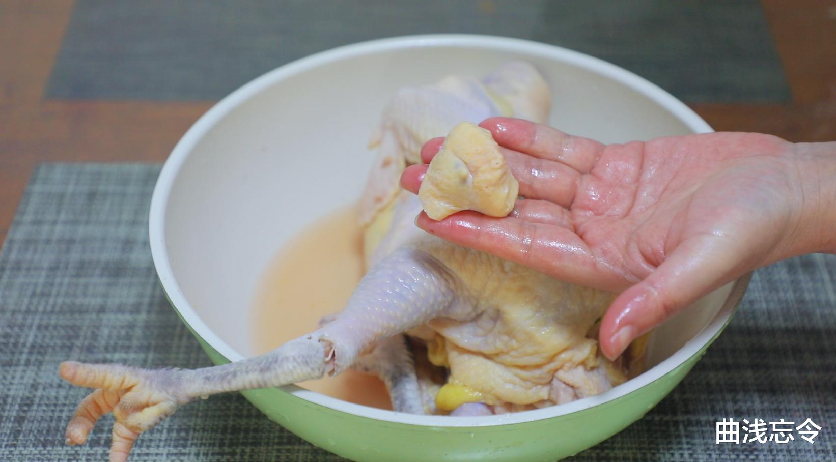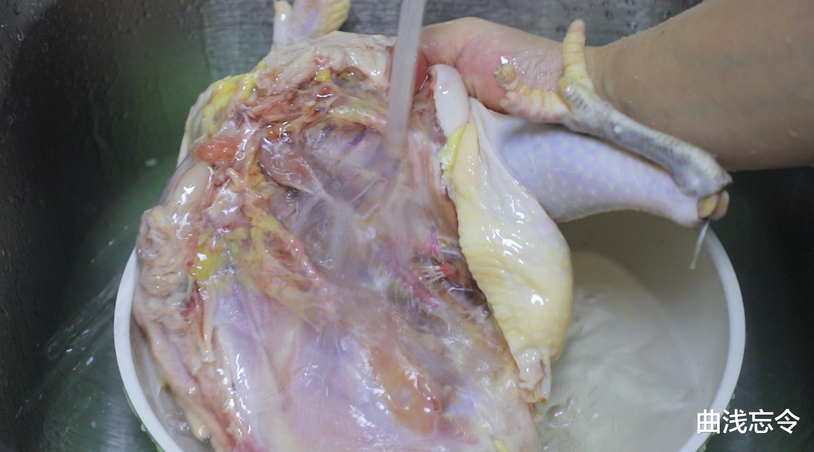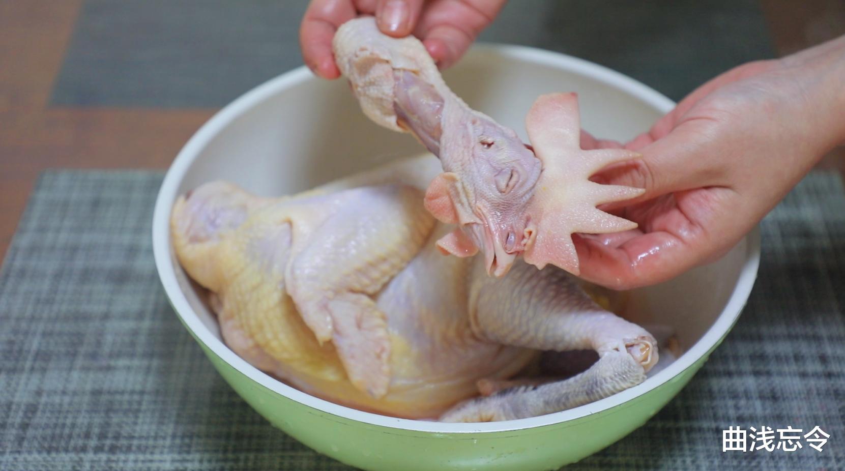 3、处理鸡:新鲜黄油鸡一只,如果不喜欢头脖部分就直接剪去不要,鸡指甲剪掉,残余鸡绒毛拔掉,鸡尾翘剪掉不要。腹腔内的鸡肺和鸡肾挖掉不要。腹腔内的鸡蛋、鸡胗、鸡心等,以及鸡屁股部分和鸡脖部分多余的鸡油可以留下来,可以搭配泡菜做泡菜鸡胗。