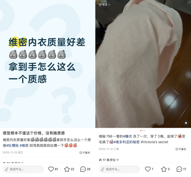 而更为致命的是糟糕的品控和设计。在社交媒体上,有用户吐槽维密内衣、睡衣易起球、易变形,还有用户表示,线上、线下产品质量不同,线上“刚穿两天就起球”。