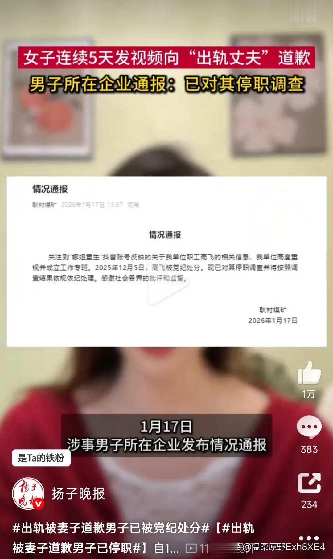 万幸的是,就在第六天道歉视频发布一个小时后,其丈夫高飞所在企业耿村煤矿发了通报:高飞已被党纪处分,停职调查,将依规依纪处理。