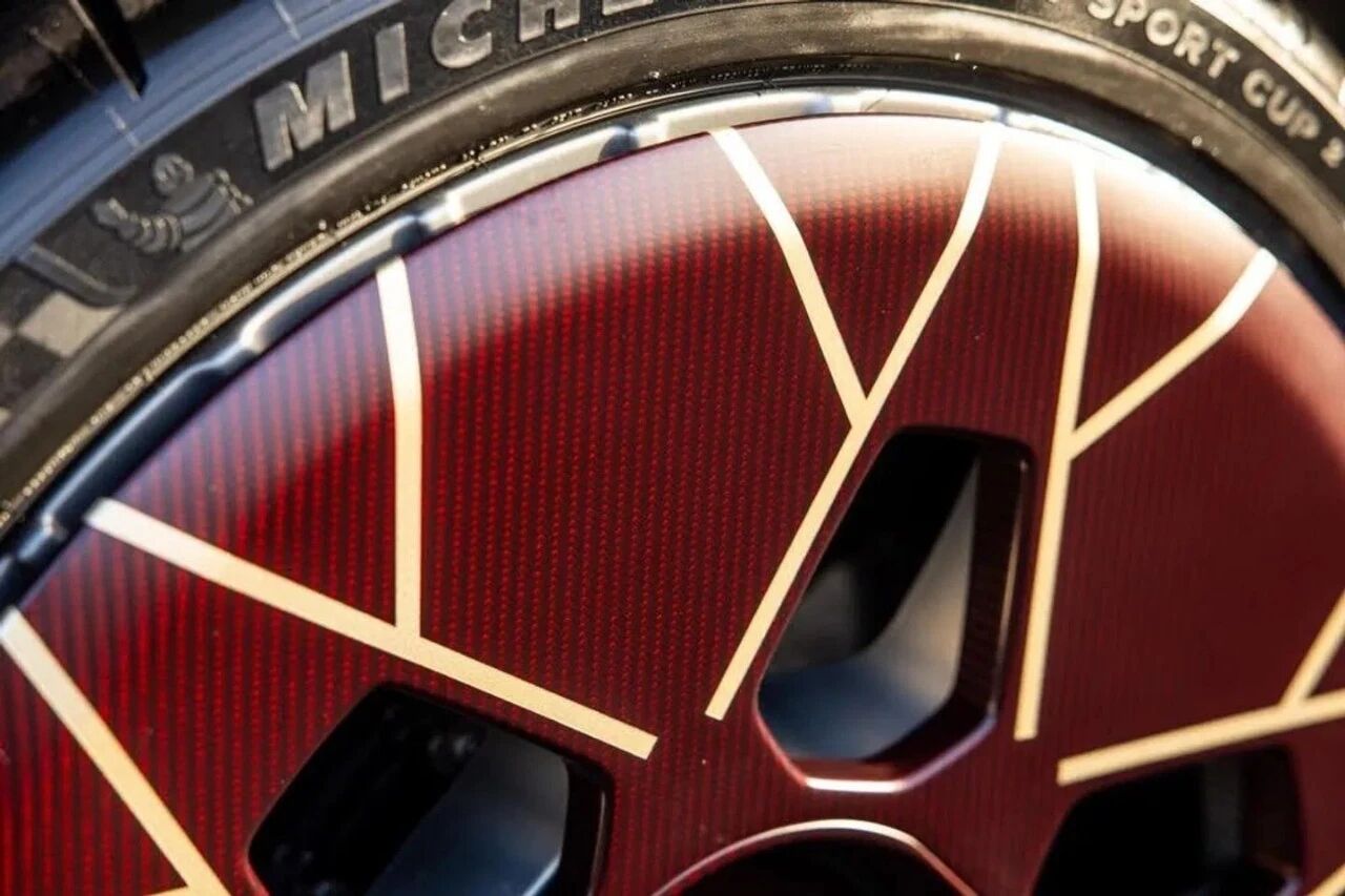 外观与底盘的升级更是不计成本。全碳纤维车身覆盖,前分流器、侧通风口、扩散器与格栅均带哑光红碳套件,70年代赛车风格尾翼提供强悍下压力;21英寸锻造镁合金轮毂配碳纤气动罩,减簧下质量14公斤,致敬经典“Muncher”勒芒赛车 。底盘配Multimatic ASV赛道级减震器,3D打印后副车架与钛合金四出排气,再加上赛车级锂电池减重11.5公斤,每一项都为赛道而生 。