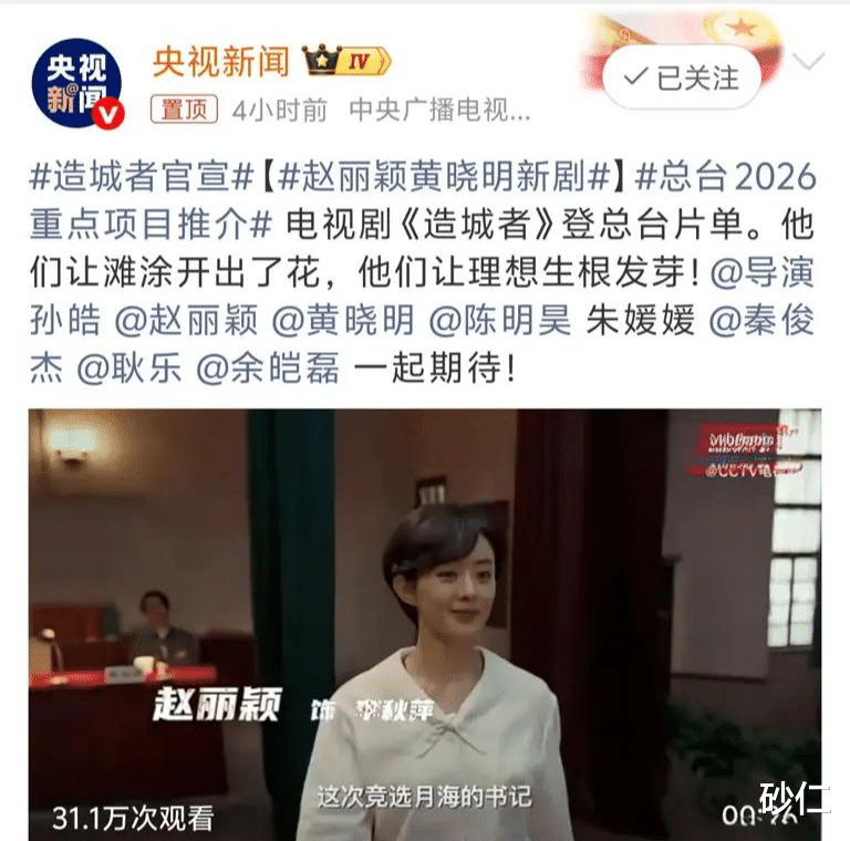 央视近日公开了 2026 年大剧片单,特意将赵丽颖、黄晓明主演的《造城者》置于顶端,并且单独发布,这似乎是要特意地,吸引大家的关注。