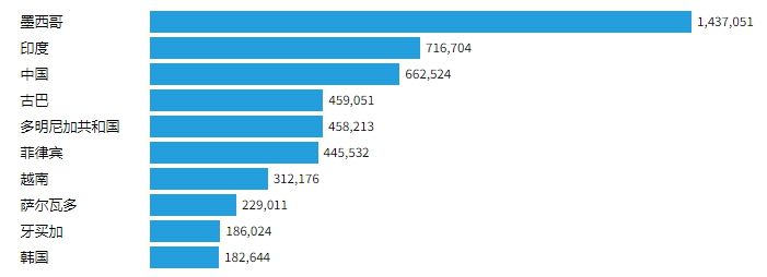 在过去十年的近1000万绿卡获得者中,14.4%来自墨西哥,其次是印度(7.2%)、中国(6.6%)、古巴(4.6%)和多米尼加共和国(4.6%)。也就是说,十年来有66万中国人移民美国。