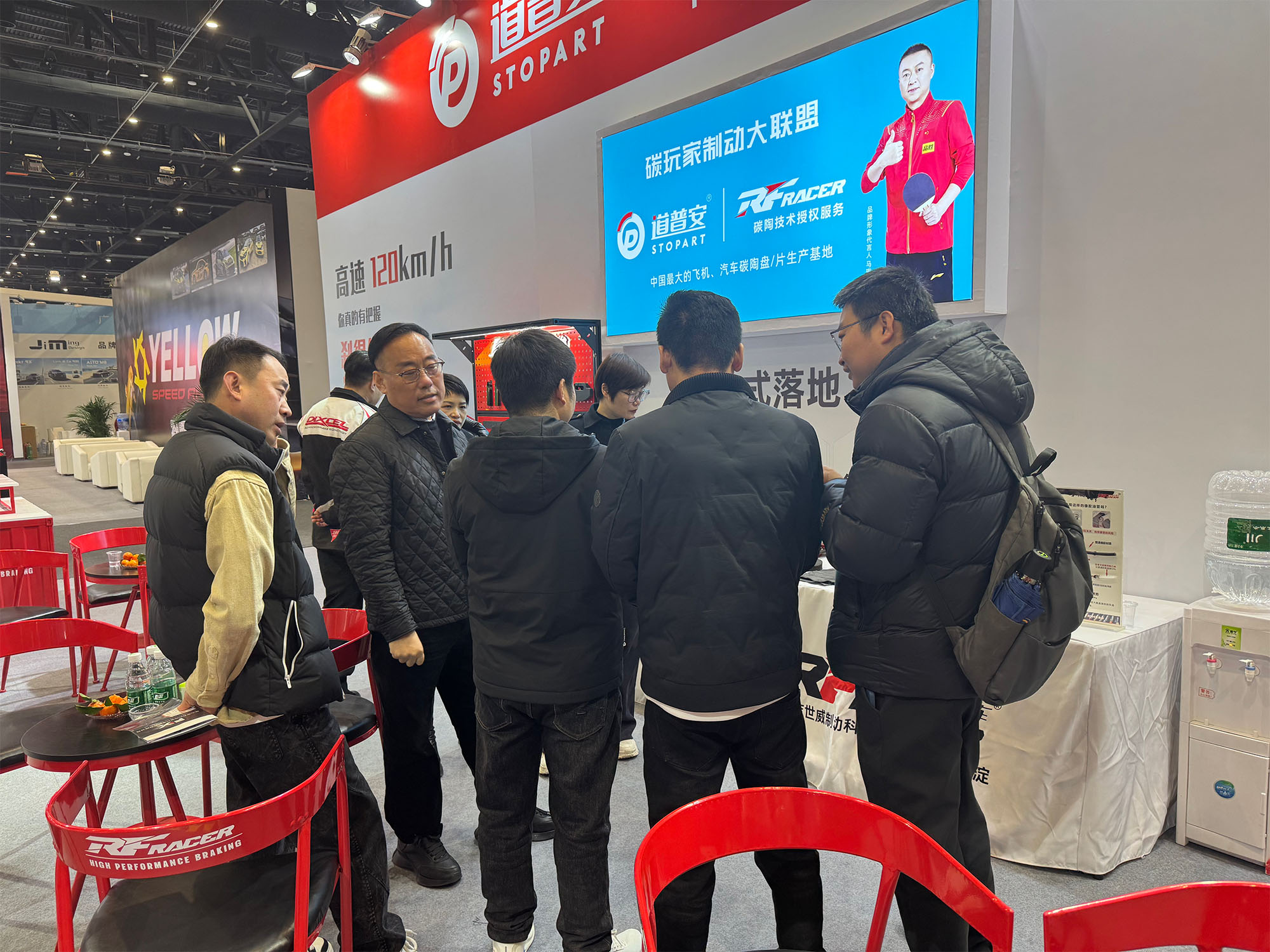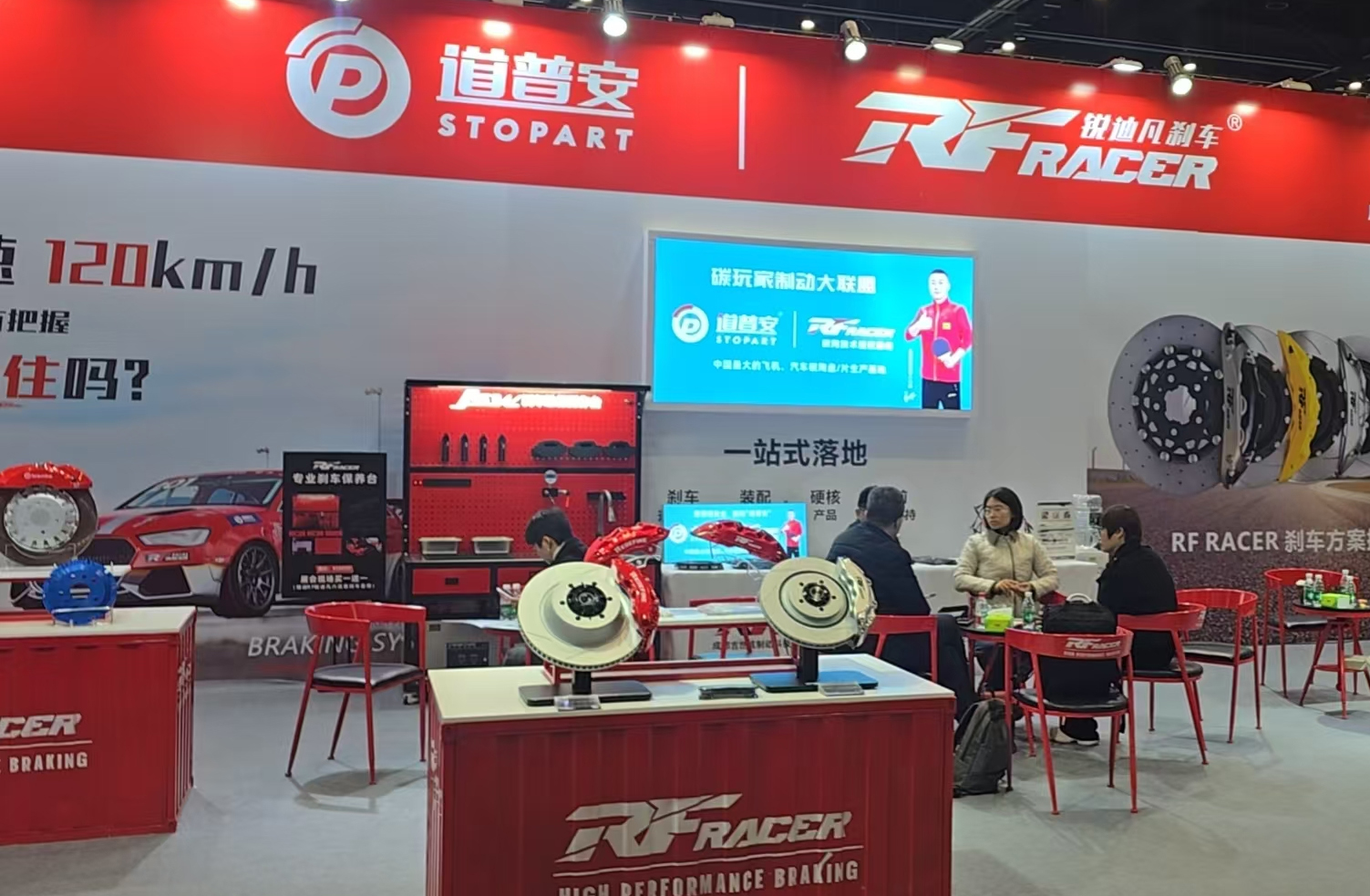 在 RF RACER 与 道普安(STOPART)联合发起的“中国碳玩家制动大联盟”展区,红色的洽谈桌前座无虚席。来自全国各地的门店老板、改装主理人以及高阶玩家们,正围坐在一起,共同探讨着碳陶制动升级的财富密码。