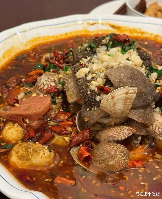 海鲜毛血旺,相对川菜,减少了麻味,辣味也刚好,里面的食材是毛肚、花甲、鹌鹑蛋等,用地道的二荆条调和,香辣口感十足。