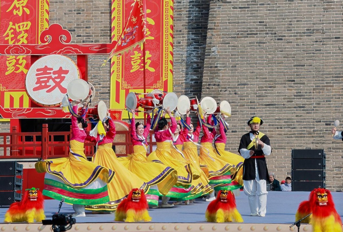 在众多雄浑威武的鼓队中,吉林省和龙市文化馆送演的《红太阳照边疆》是一个异数。它集民乐、舞蹈、歌曲于一身,在舒缓演绎中递进节奏,在小伙儿的空中腾挪中达到高潮。随后,身着粉色上衣黄色长裙的姑娘击打腰鼓,高速旋转,上演了一场震撼的最炫民族风。