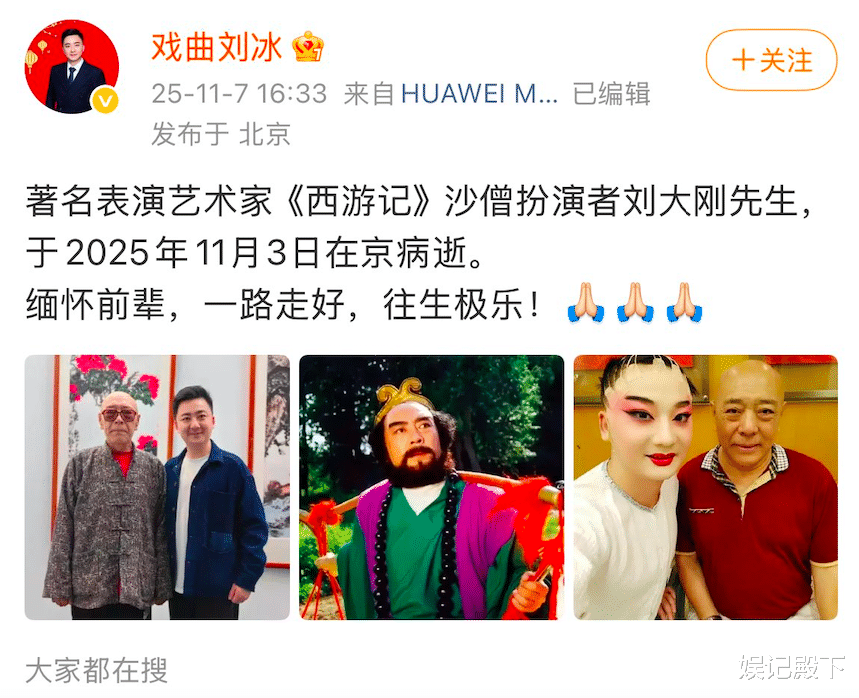 2025年11月7日下午16:33分,豫剧大师马金凤弟子刘冰在自己的微博账号发文透露沙僧扮演者刘大刚先生已经于四日前去世