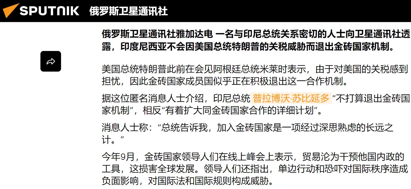 对此,一名印尼总统的身边人立马站出来解释,表示印尼不会因为特朗普的关税威胁,而退出金砖国家组织,相反还计划扩大合作。