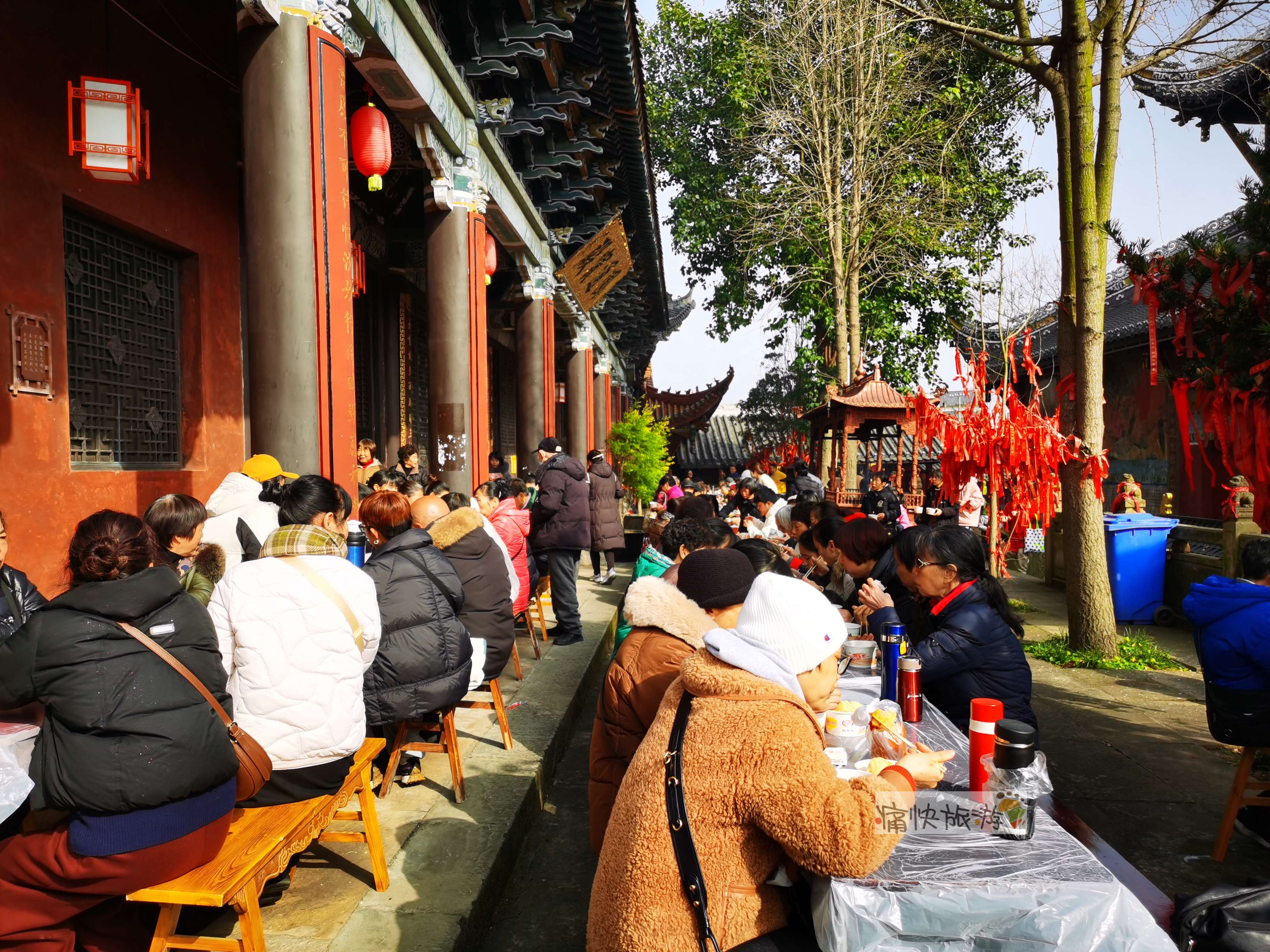 不一会儿,圆通宝殿前及周边已坐满喝腊八粥的人们。