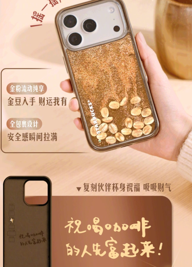 据了解,4款咖啡豆主题手机壳包括:闪闪豆子款、策马逐光款、如意卡包款、好运福熊款等。其中,闪闪豆子款透明外壳包裹流动金粉与仿真咖啡豆,摇晃可见动态效果,适配iPhone 14-17全系及华为Mate 70/Pro,手机壳内侧印有星巴克伙伴手写祝福语,提升情感价值。同时,需在2026年1月27日-2月1日期间,通过星巴克指定渠道累计消费250元,且限星巴克会员参与,才有机会预约1个手机壳。