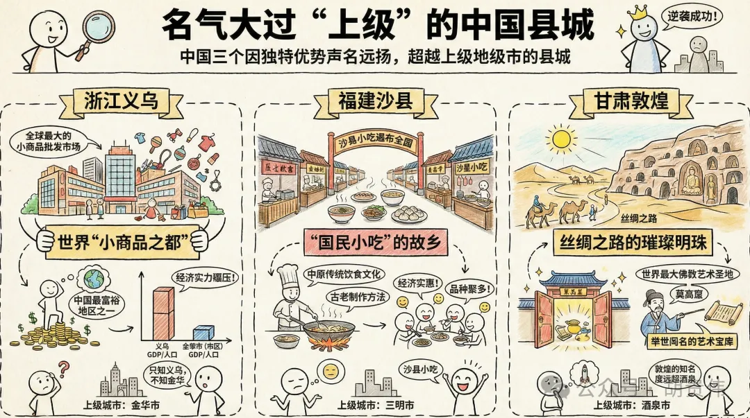 历史的厚度:像敦煌,它的光环是千年的丝路赋予的,行政区划改不了它的历史地位。产业的极致:像义乌,把“做生意”这件事做到了人类的极限,形成了无法替代的黑洞效应。品牌的突围:像沙县,抓住了时代的胃,用极致的性价比占领了用户心智。不管是“大哥带小弟”,还是“小弟强过大哥”,这都是中国地理活力的体现。只要你有绝活,哪怕只是一个县,也能站在舞台的最中央。你还知道哪些名气盖过上级城市的“牛县”?来评论区曝光它们,让我们看看谁才是真正的“地理逆子”!