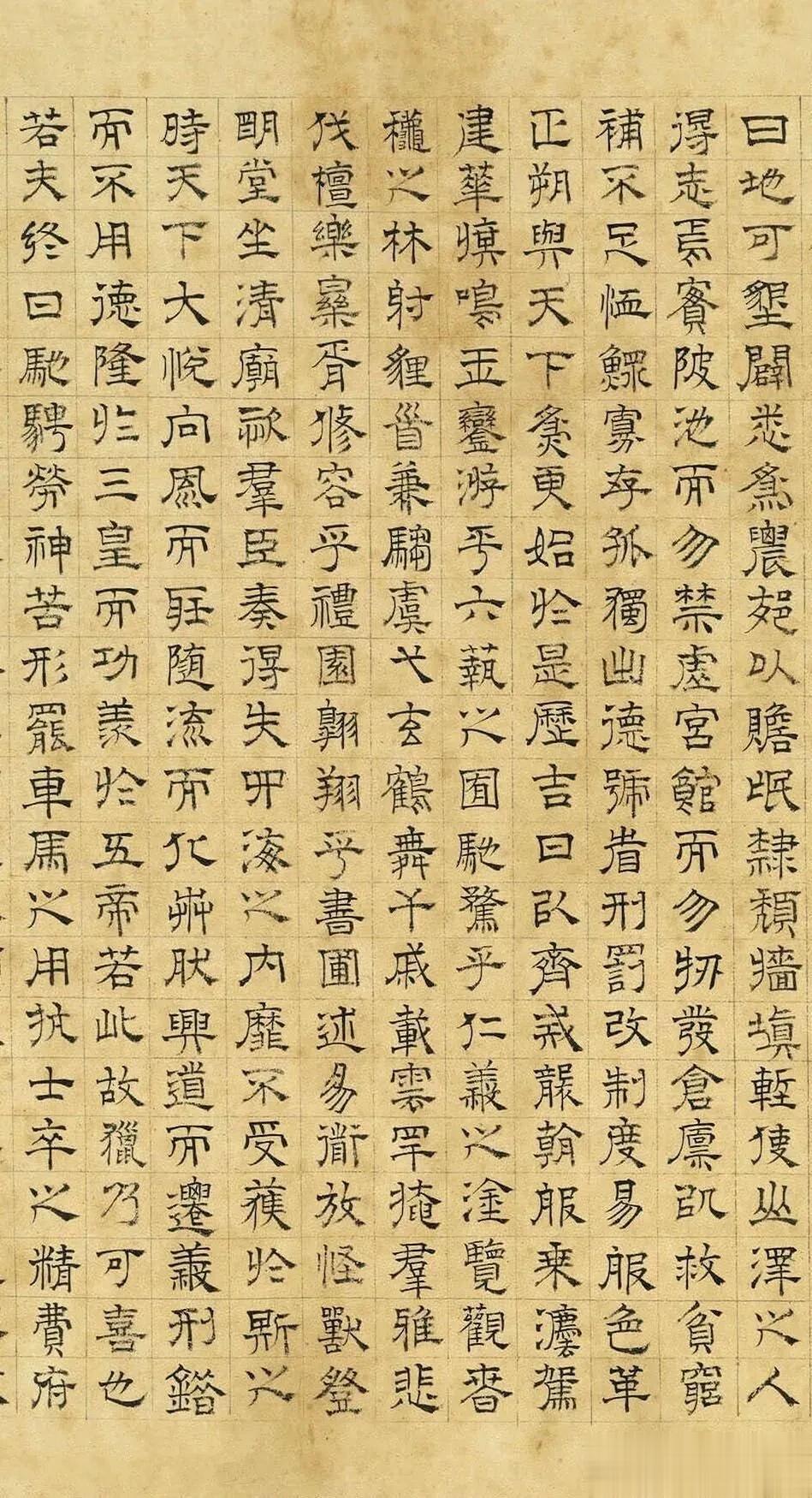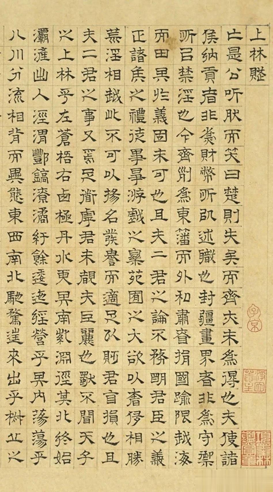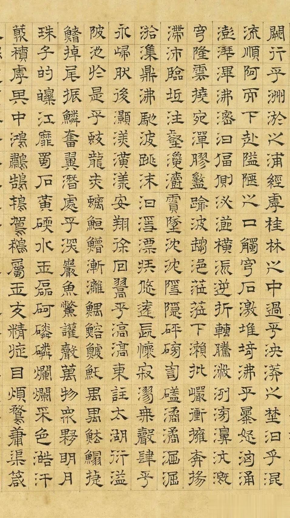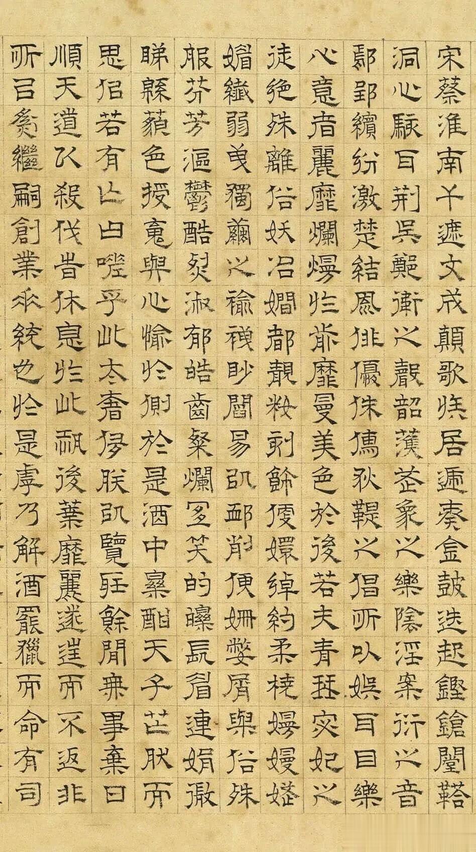 结体上,字形呈扁方之势,排布于界格中却疏密得宜,两千余字的长卷字字端稳,行行匀齐,既保持了汉隶的庄重感,又消解了刻板之弊。整体气息醇厚古朴,把司马相如大赋的宏阔意境,化作笔墨间的沉静与典雅。即便并非名家真迹,其隶书技法的成熟度与艺术表现力,仍为隶书学习者提供了极佳的临摹范本,可从中体悟明人对汉隶的传承与创新。