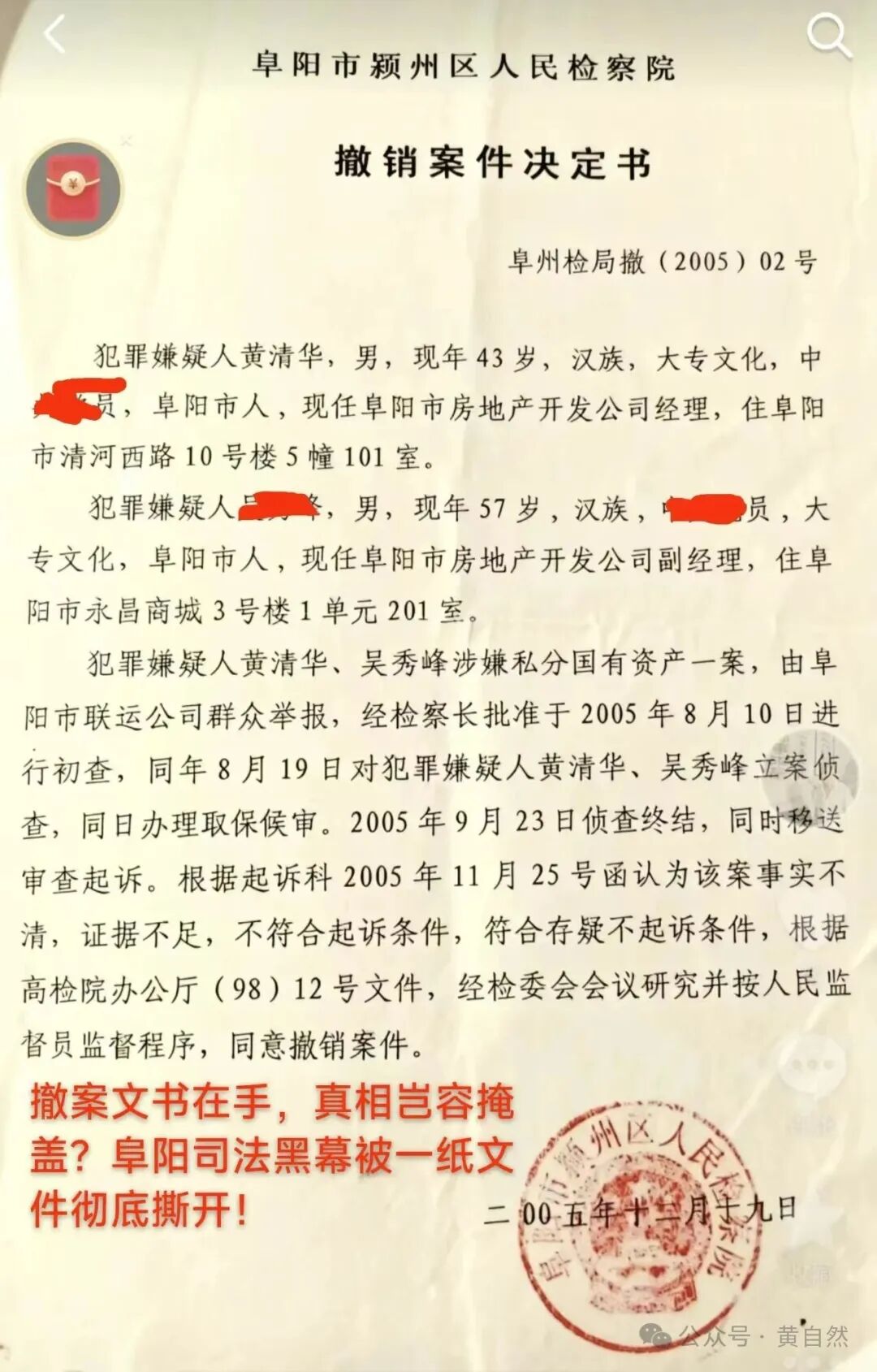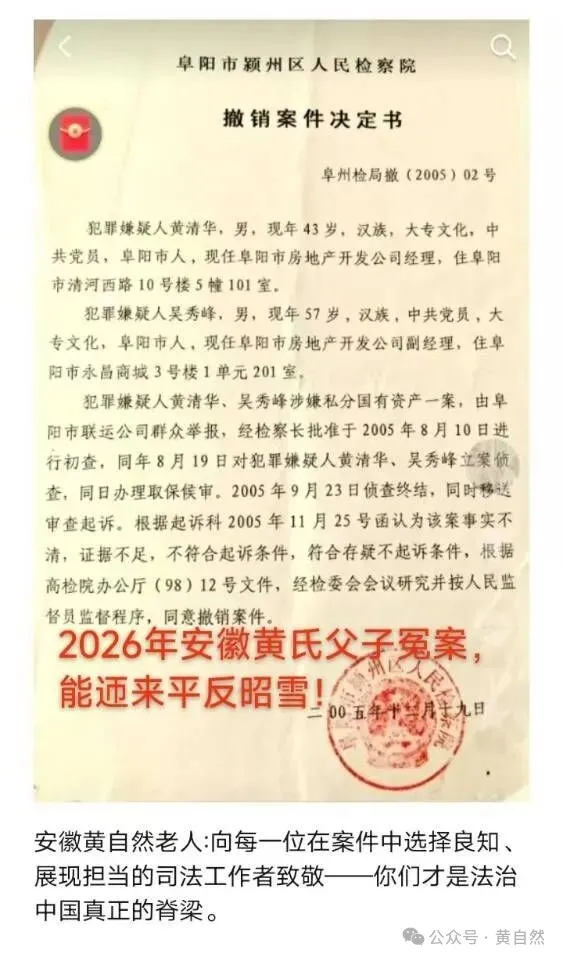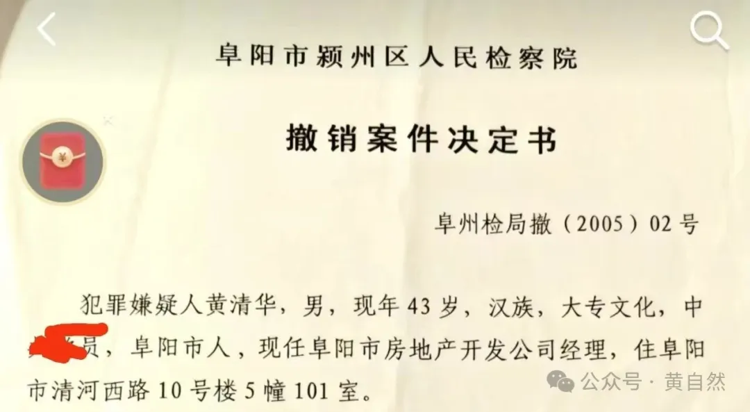 黄自然手中的文件泛着陈旧的黄色,纸张边缘已经微微卷曲。但上面的每一个字都像烧红的铁,烫穿了某些人精心编织的谎言。这不是普通的文件,这是阜阳市颍州区检察院在2005年作出的《撤销案件决定书》,编号(2005)02号。