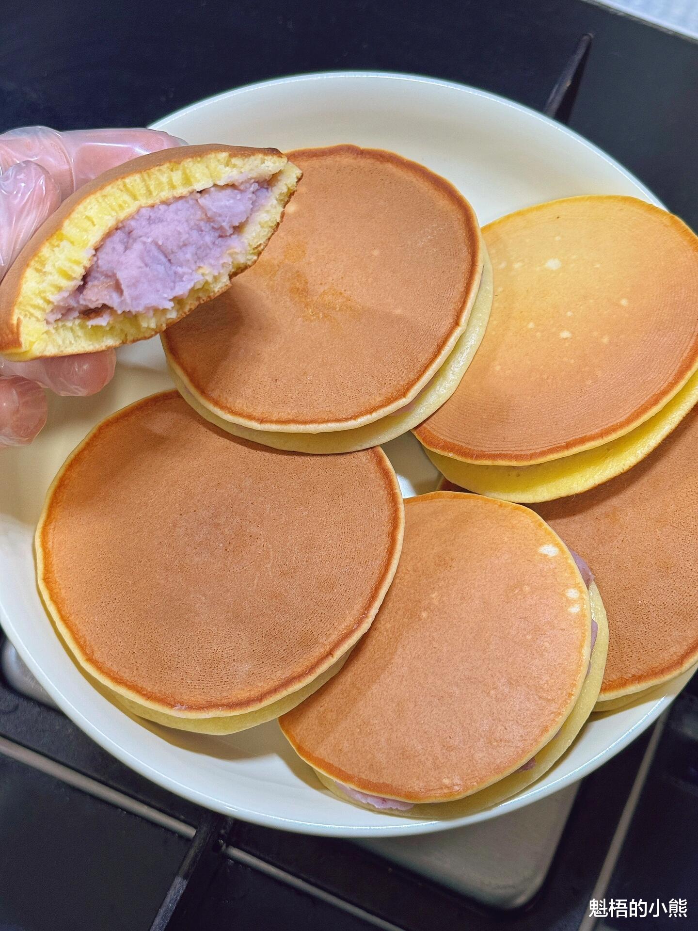 我第一次做这款铜锣烧,是孩子看完哆啦A梦之后吵着想吃。照着方子自制完成,孩子吃得满嘴芋泥,还举着铜锣烧兴奋地喊:“我是哆啦A梦!”看着孩子开心的模样,我便常常制作这款小点心。无需烤箱、无需复杂工具,一口平底锅就能轻松搞定。